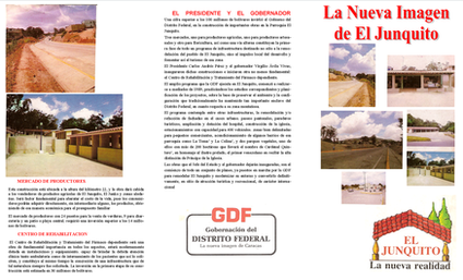 El Presidente de la República, Sr. CARLOS ANDRES PEREZ, inauguró cuatro obras que impulsarán la actividad económica y mejorarán la calidad de vida de los habitantes de la Parroquia EL JUNQUITO. Igualmente, dio inicio a la construcción de un Centro de Rehabilitación para jóvenes con problemas de drogadicción, estas obras tienen una inversión superior a los 100 MILLONES DE BOLIVARES.